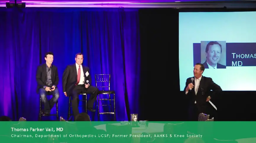 The first level-setting session of this day-long conference set the stage by highlighting the top 10 healthcare issues and the top 10 technologies available to address them. This was led by several of healthcare’s top authorities on orthopedics and medical technology: Mark Froimson, MD, chief clinical officer for Trinity Health, the largest multi-institutional Catholic health care delivery system in the nation; Daniel Kraft, MD, faculty chair of medicine at the Silicon-Valley think tank, Singularity University; and Thomas Parker Vail, MD, UCSF’s very own Chairman of the Department of Orthopedic Surgery and former president of AAHKS.
