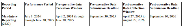 - The second voluntary reporting period will begin with pre-operative PRO data on procedures performed July 1, 2023 through June 30, 2024.