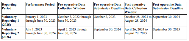 - The first voluntary reporting period will begin with pre-operative PRO data on procedures performed January 1, 2023 through June 30, 2023.