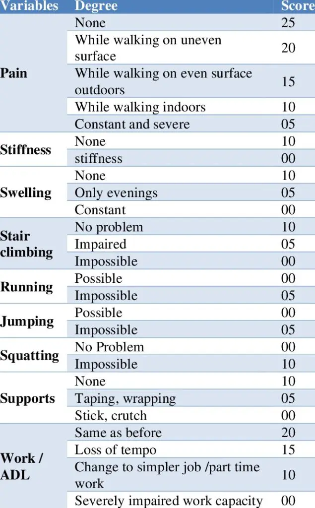 The scoring of this tool is simple. Each question is scaled differently representing the question’s weight in the overall score. Question scales can range from 0-5 to 0-25. Each of the question responses is summed for a total score ranging from 0 (worst symptom burden and function) to 100 (no symptom burden). There are two subscales within this tool: ankle function and ankle symptoms. However, the utility of the subscales is minimal secondary to the limited number of questions, thus they should not be utilized for research and have limited clinical applicability.